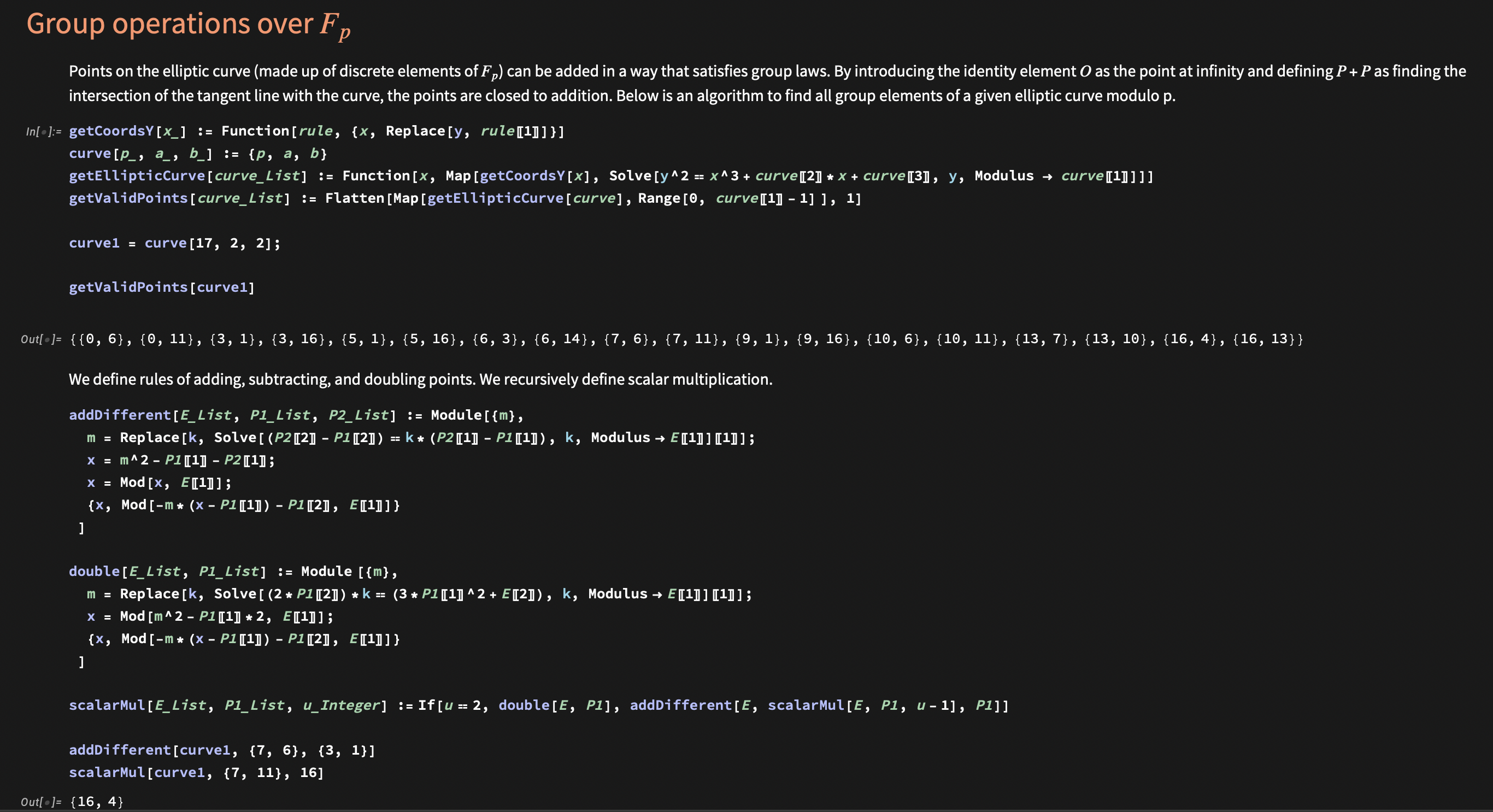 Interestingly, they still do when points go completely discrete. By discarding plots and using modular mathematics, elliptic curves are more abstractly defined as $E: y^2 \cong x^3+bx+c \pmod{p}$ over the numbers ${0, 1, 2, 3, .., p-1}$. Now, points composed of integers modulo $p$ can be added in the same manner, but this time with algebraic formulas that replace intersections and reflections. A patchy Mathematica demonstration is shown below. The process is simple, perhaps even unimportant for our purposes.